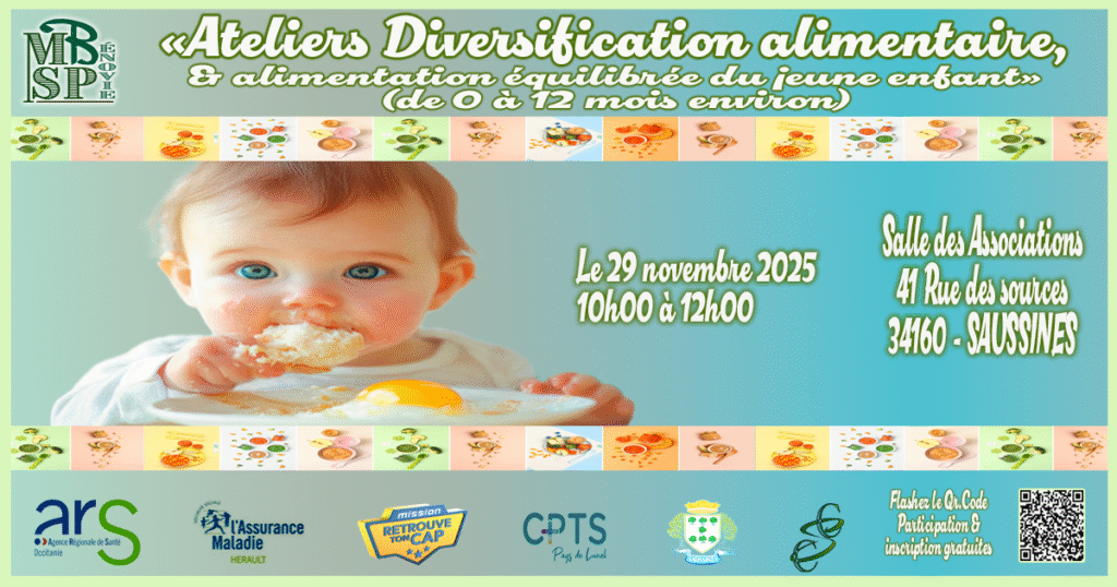 🌱 Atelier “Diversification alimentaire & équilibre du jeune enfant”👶 Vous débutez la diversification alimentaire avec votre bébé ?🥕🍎 Et si on en parlait ensemble ?La Maison de Santé Bénovie vous invite à un moment d’échange convivial et plein de saveurs autour de la diversification alimentaire et de l’alimentation équilibrée du jeune enfant (0 à 12 mois) 🍼🥕🍎Parce que chaque enfant a son rythme, nos professionnels de santé vous proposeront des conseils pratiques et bienveillants pour aborder cette étape essentielle avec sérénité et confiance 💚👉 Au programme :• Des astuces simples pour bien débuter la diversification• Des échanges entre jeunes parents• Des idées repas pour des tout-petits gourmands et en pleine santé📅 Samedi 29 novembre 2025🕙 De 10h à 12h📍 Salle des Associations, 41 Rue des Sources, 34160 Saussines🎟️ Atelier gratuit – sur inscription👉 Cliquez ici pour vous inscrire : form.dragnsurvey.com/survey/r/93620df8 #MSPBénovie #PréventionSanté #DiversificationAlimentaire #ParentsBébés #SantéEnfant #AtelierSanté #CPTSPaysdeLunel #ARS #MissionRetrouveTonCap Voir plusVoir moins
